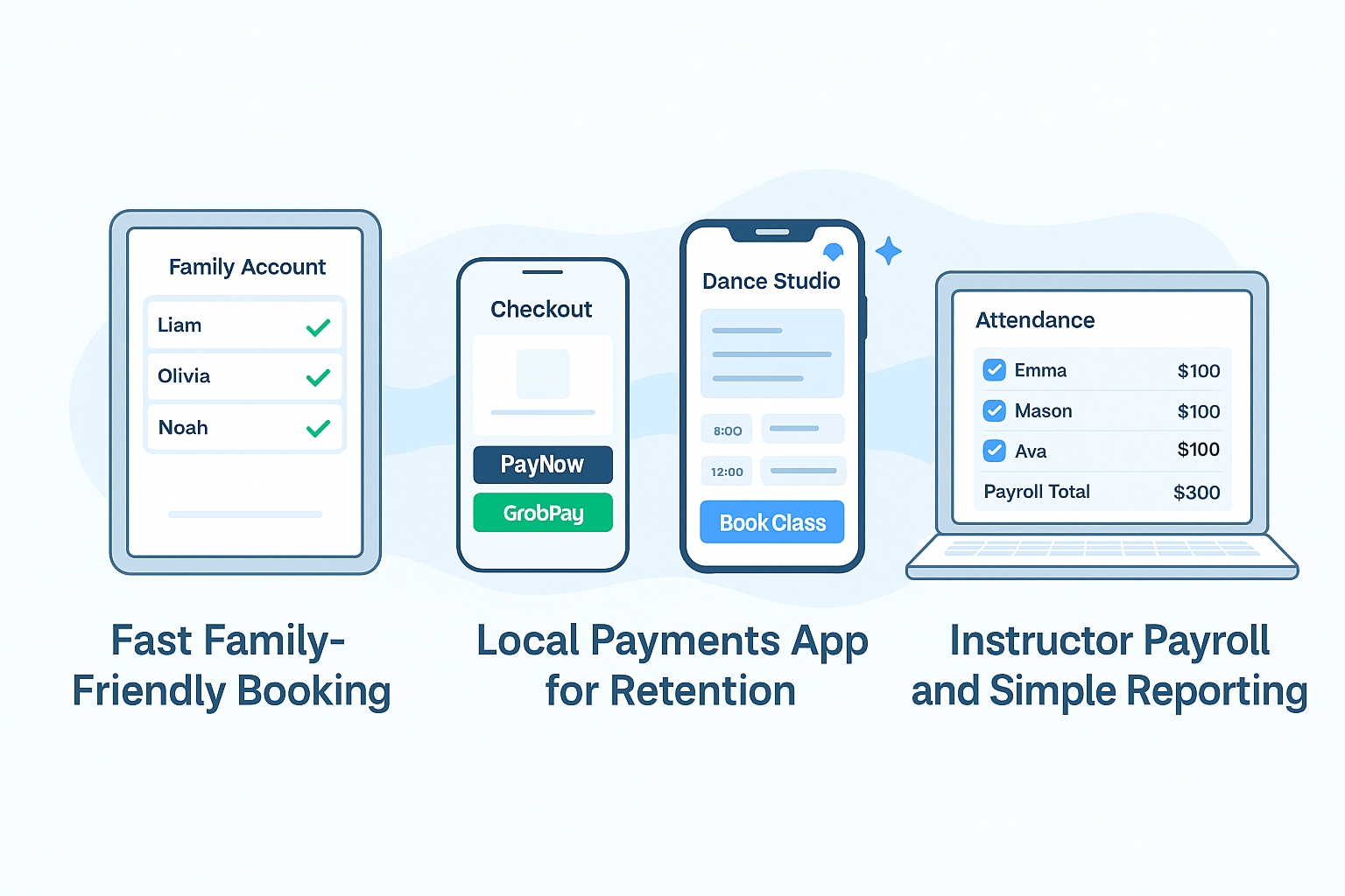 Day 1: Start by importing your class schedule and defining term dates. Configure your course types (terms, workshops, drop-ins) and set your make-up rules and cancellation policies. Getting this foundation right ensures your clients will see accurate availability. Day 2: Set up family accounts and test sibling enrolment. Make sure consent forms and waiver flows are working correctly. Walk through the checkout flow as a parent would and adjust copy where needed. Day 3: Connect PayNow and GrabPay so payments are local and instant. Run a test transaction to verify that everything lines up with your bank or payment processor. Day 4: Set up auto waitlist backfill so if a class is full, families can join a queue and be automatically slotted in when space opens. Day 5: Enable the mobile app or branded app add-on. Invite staff or a small group of parents to install it and test push notifications, mobile booking, and access to make-up credit balances. Day 6: Configure payroll logic by setting rates for your different class types. Record sample attendance and export a payroll report to ensure it matches your expectations. Day 7: Collect parent feedback from your test group. Ask about the entire flow—from sibling booking to payment to make-ups. Make final tweaks to schedules or messaging. Day 8: Go live. Send an announcement to all families that booking is now online, payments can be made via PayNow and GrabPay, and the mobile app is available. Day 9: Monitor registrations, waitlists, and payment completion. Address any questions in real time. Day 10: Review the first week’s data. Look at how many bookings are coming in, how payments are processed, and how many make-ups were used. Refine messaging or terms if needed. Following this playbook means you can launch quickly without admin stress.