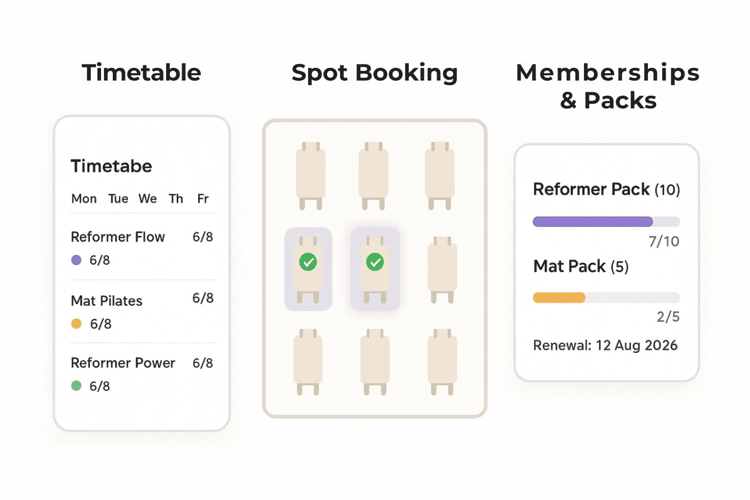 - Pilates-specific tools such as spots booking and packs