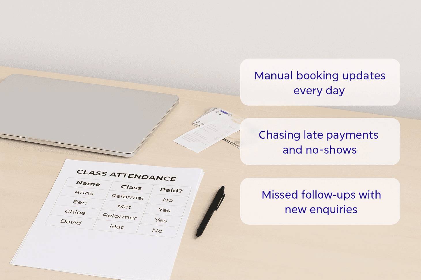 Take one typical week and estimate how much time you spend updating timetables, replying to booking messages, managing waitlists and matching attendance lists to payments.