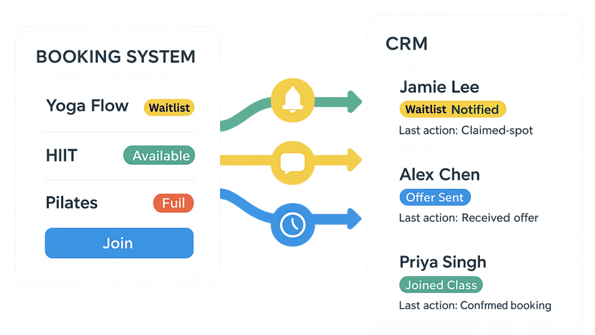 With integrated systems, that entire workflow is automated. When a class spot becomes available, the system can: