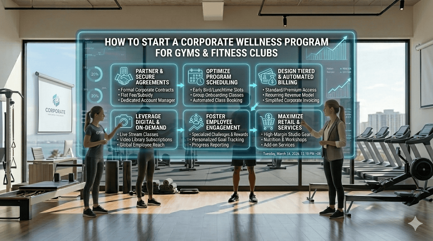 A corporate wellness program is one of the fastest-growing revenue opportunities for gyms and fitness studios in 2026. As companies invest more in employee wellbeing, gyms can offer structured corporate fitness programs that drive recurring revenue, improve class occupancy, and build long-term partnerships.