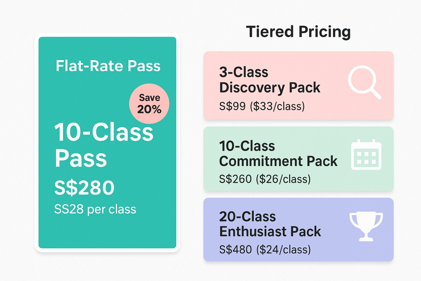 - 20‑Class Enthusiast Pack: S$480 (just S$24 per class) — perfect for those who are truly committed.