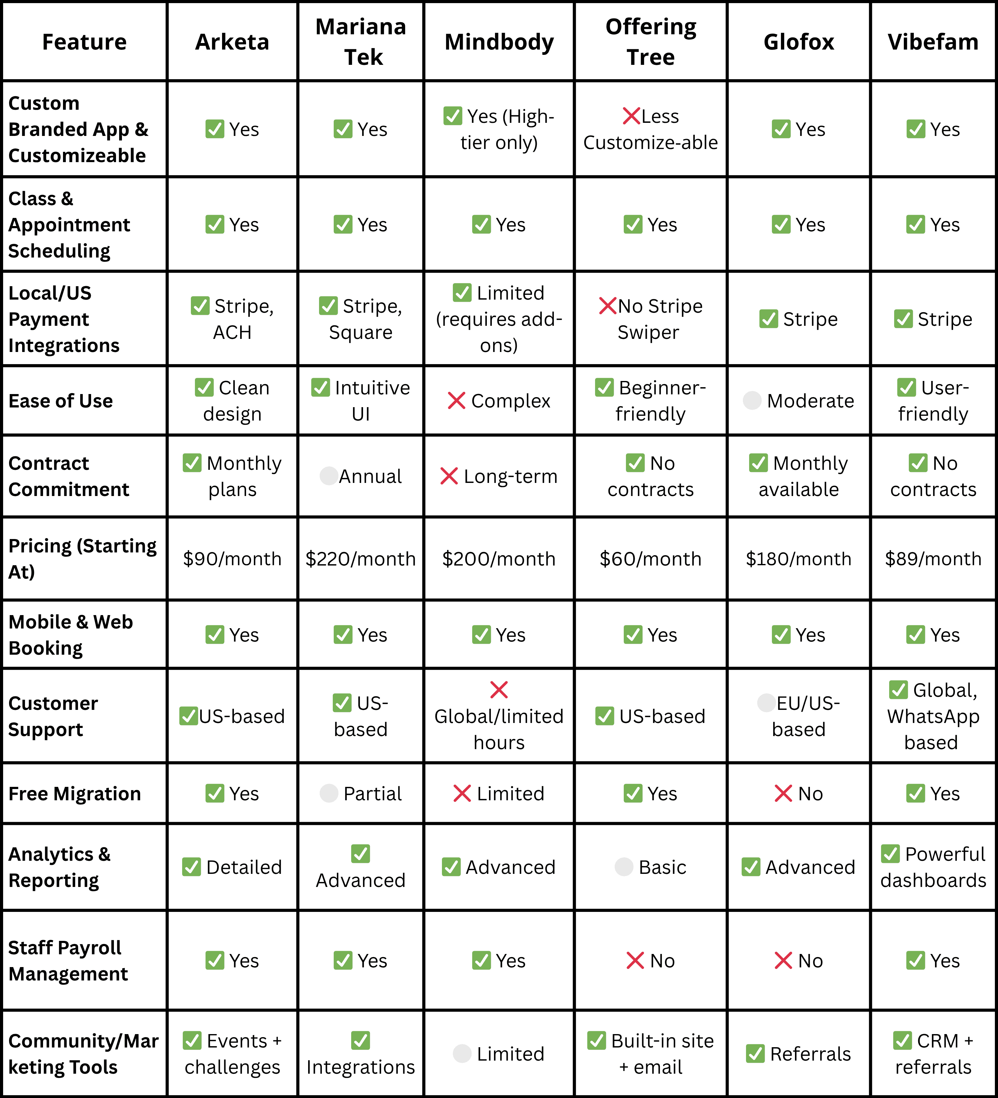 - Arketa: Offers hybrid and virtual class management, but additional costs, migration challenges, and limited support may hinder growth.