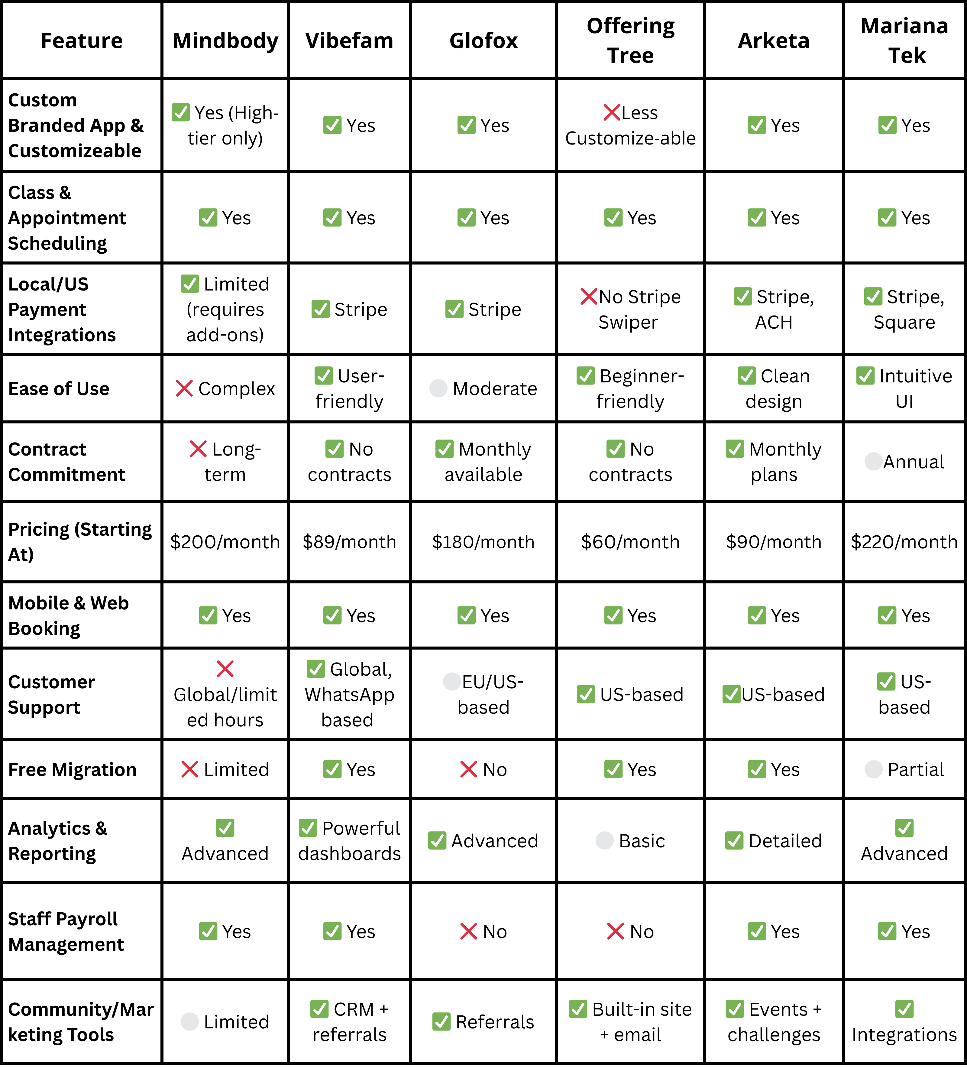 - Vibefam Boutique & mid-sized studios | Affordable (<$90/mo), intuitive, fast onboarding, Stripe support, marketing tools | ⚠️ Not ideal for franchises