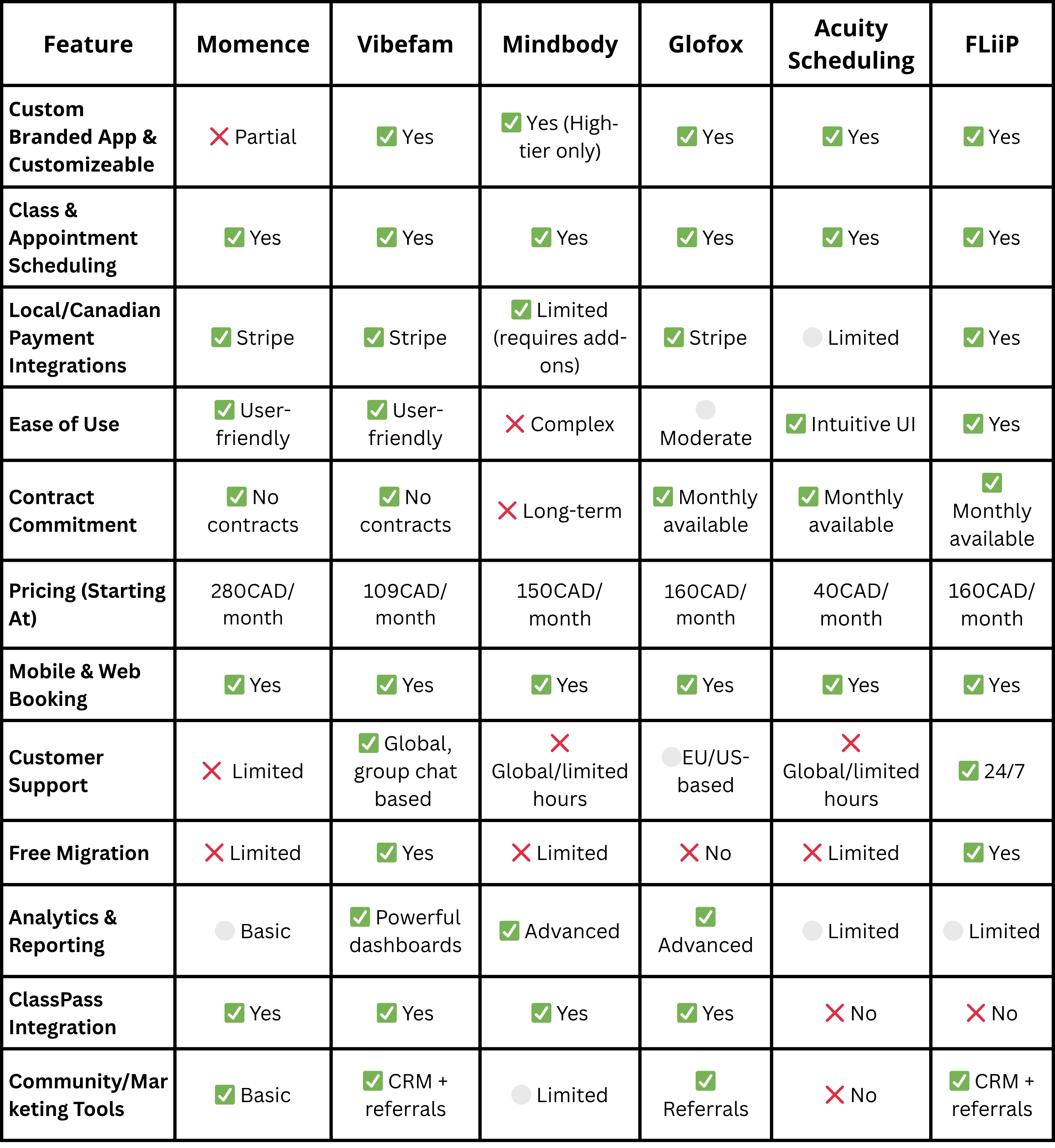 Based on local feedback and reviews on G2, Capterra, and Reddit, Vancouver studios cite several challenges with Momence: