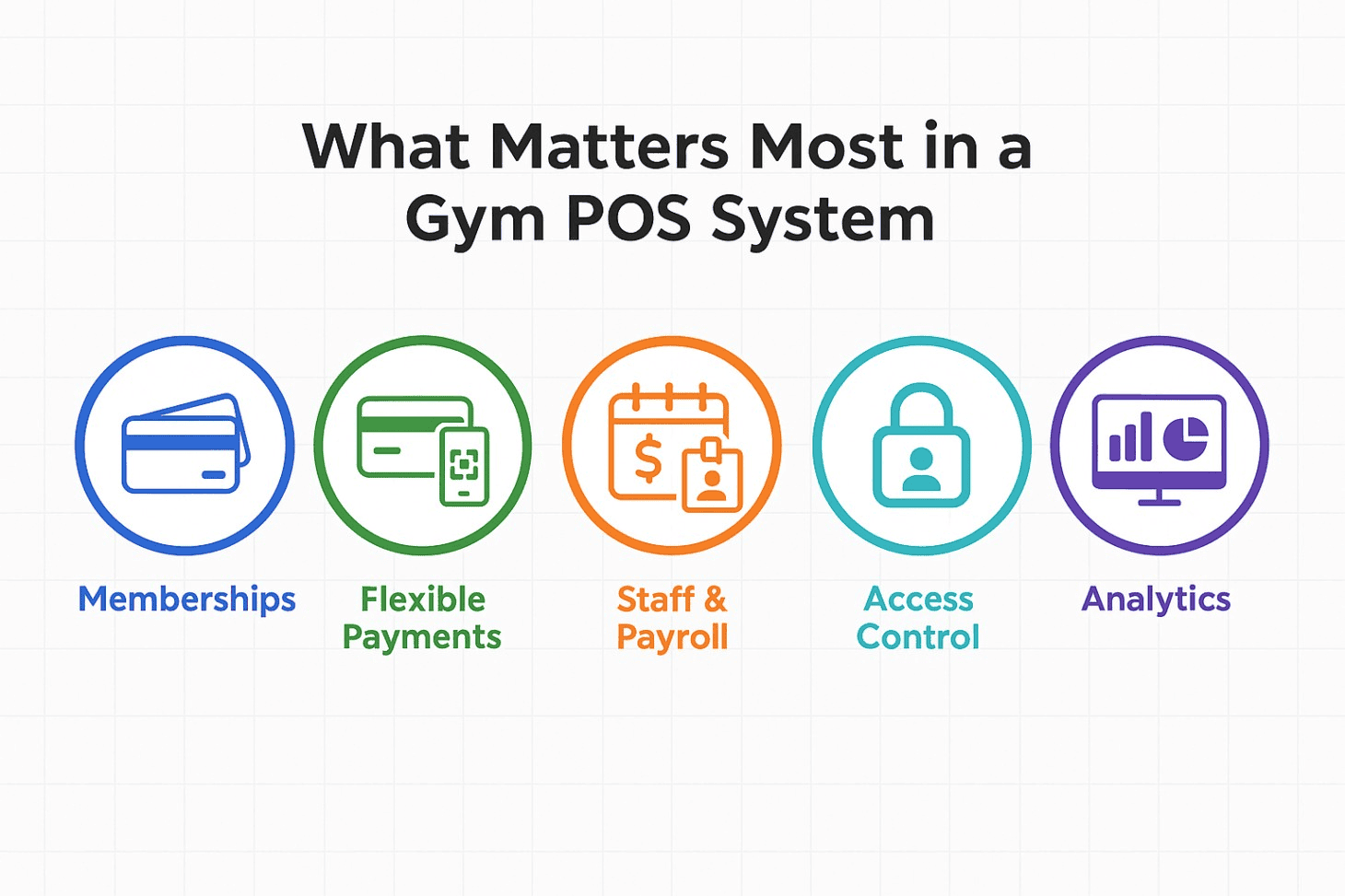 - A gym POS system should manage memberships, support flexible payments, simplify staff management, provide access control, and deliver analytics.